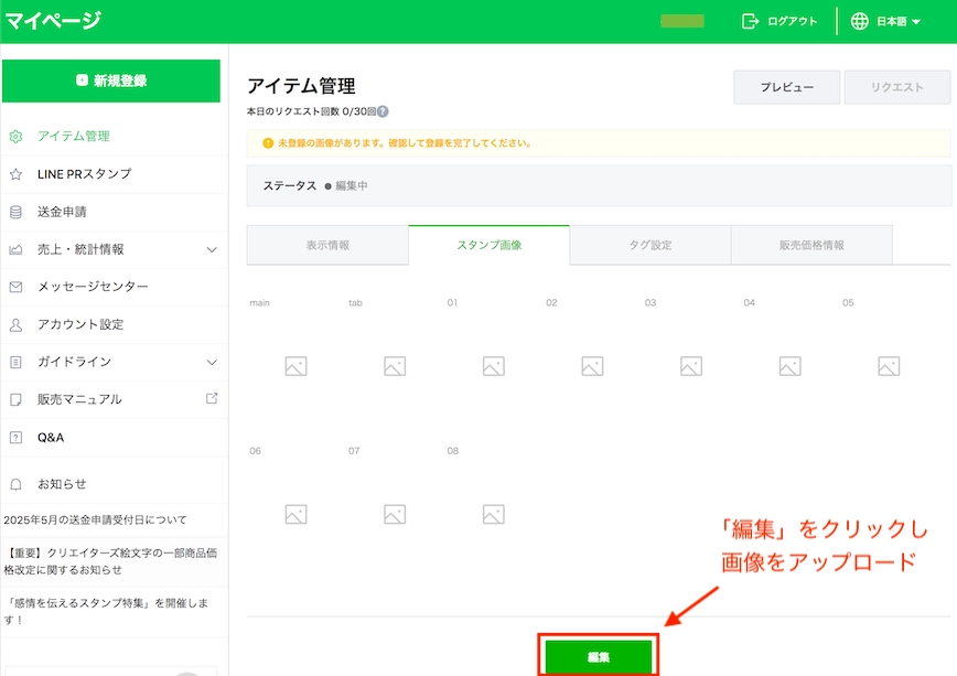 マイページから「新規登録」を選びます。スタンプの基本情報や画像のアップロード設定をここで行います。